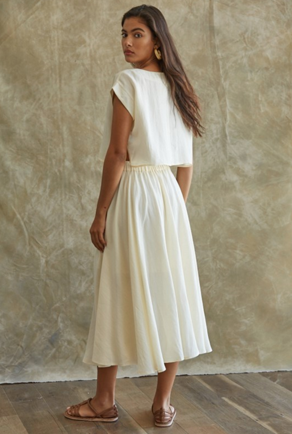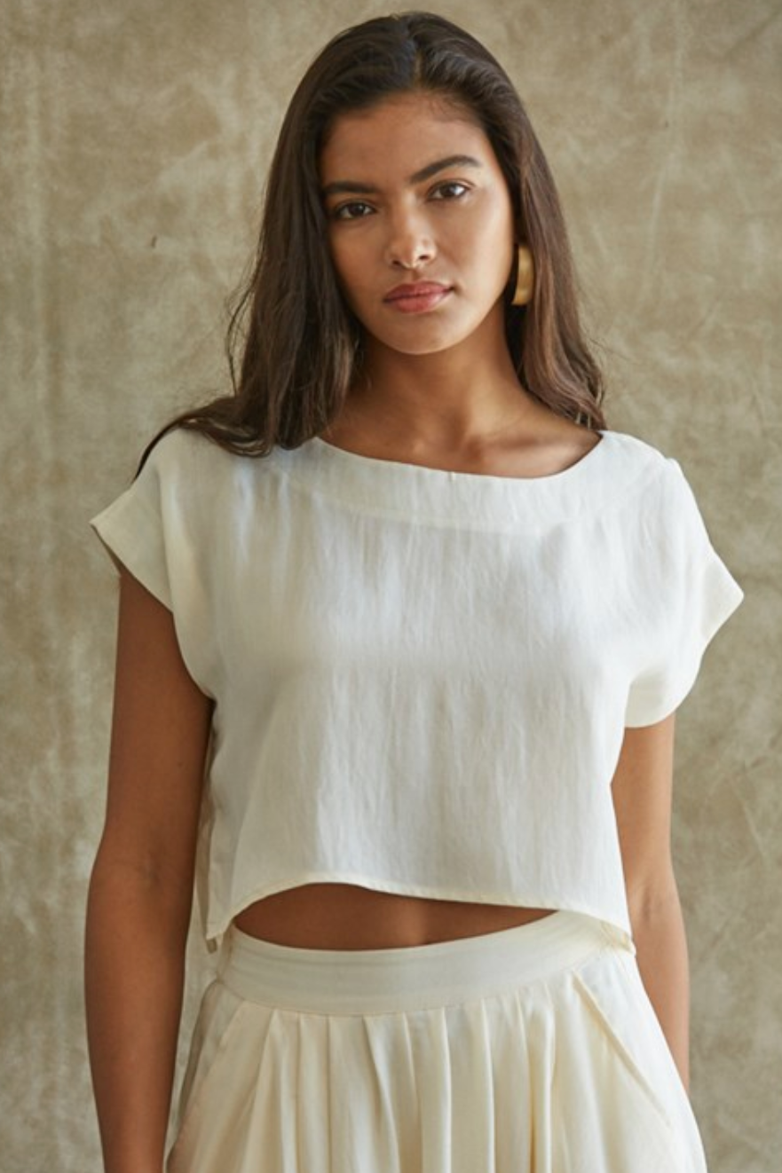 This boat neck top looks great with the matching skirt. Makes and effortless and classic look.
