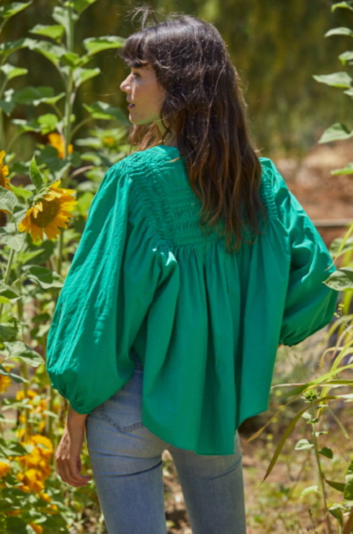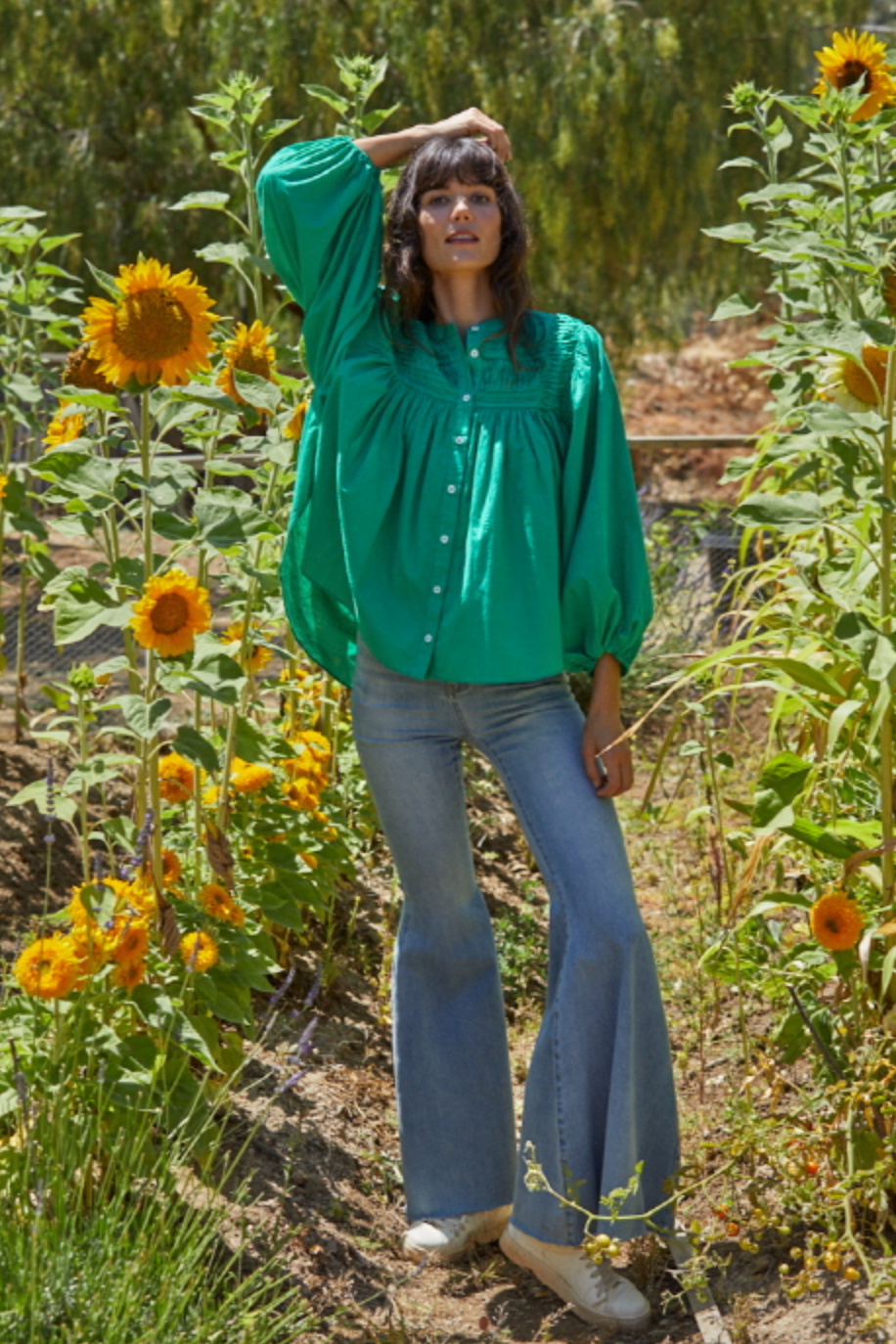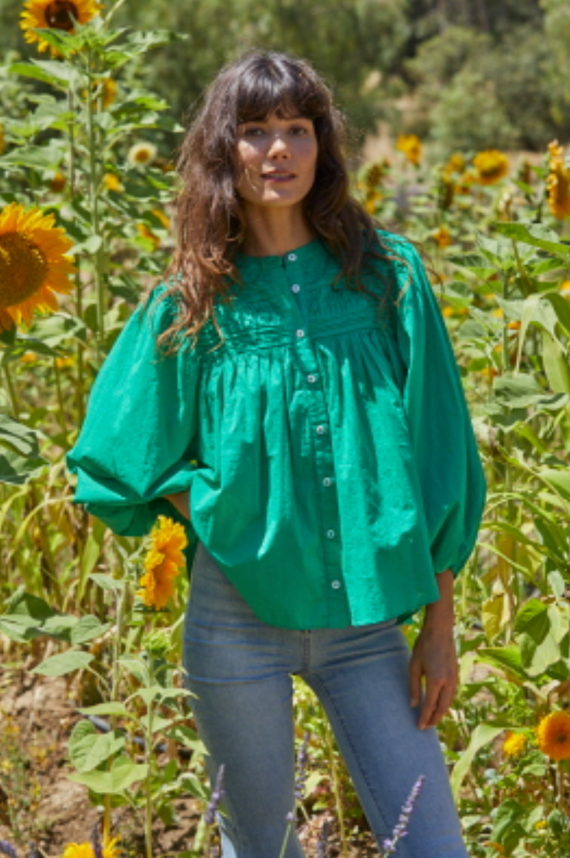 This jungle green blouse is flowy and a great pop of color for fall. Pair with a fitted pair of jeans and boots.