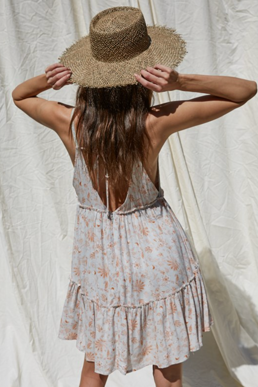 Woven rayon gauze ruffled dress with strap detailing. This dress is also lined and is super easy to wear. Looks great with summer shoes or sneakers.