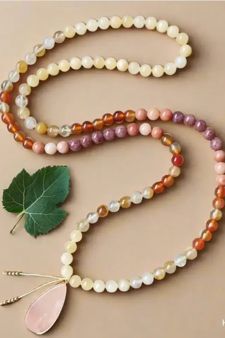 Handcrafted with 108 beads of natural Yellow Jasper, Fire Quartz, Red Onyx, and Pink Aventurine, this mala necklace promotes vitality and harmony. Featuring a Pink Aventurine pendant, it enhances creativity and emotional healing. Yellow Jasper supports personal power and confidence, Fire Quartz energizes and revitalizes, Red Onyx provides strength, and Pink Aventurine fosters balance. Perfect for daily wear or meditation, this necklace measures around 91cm.
