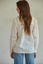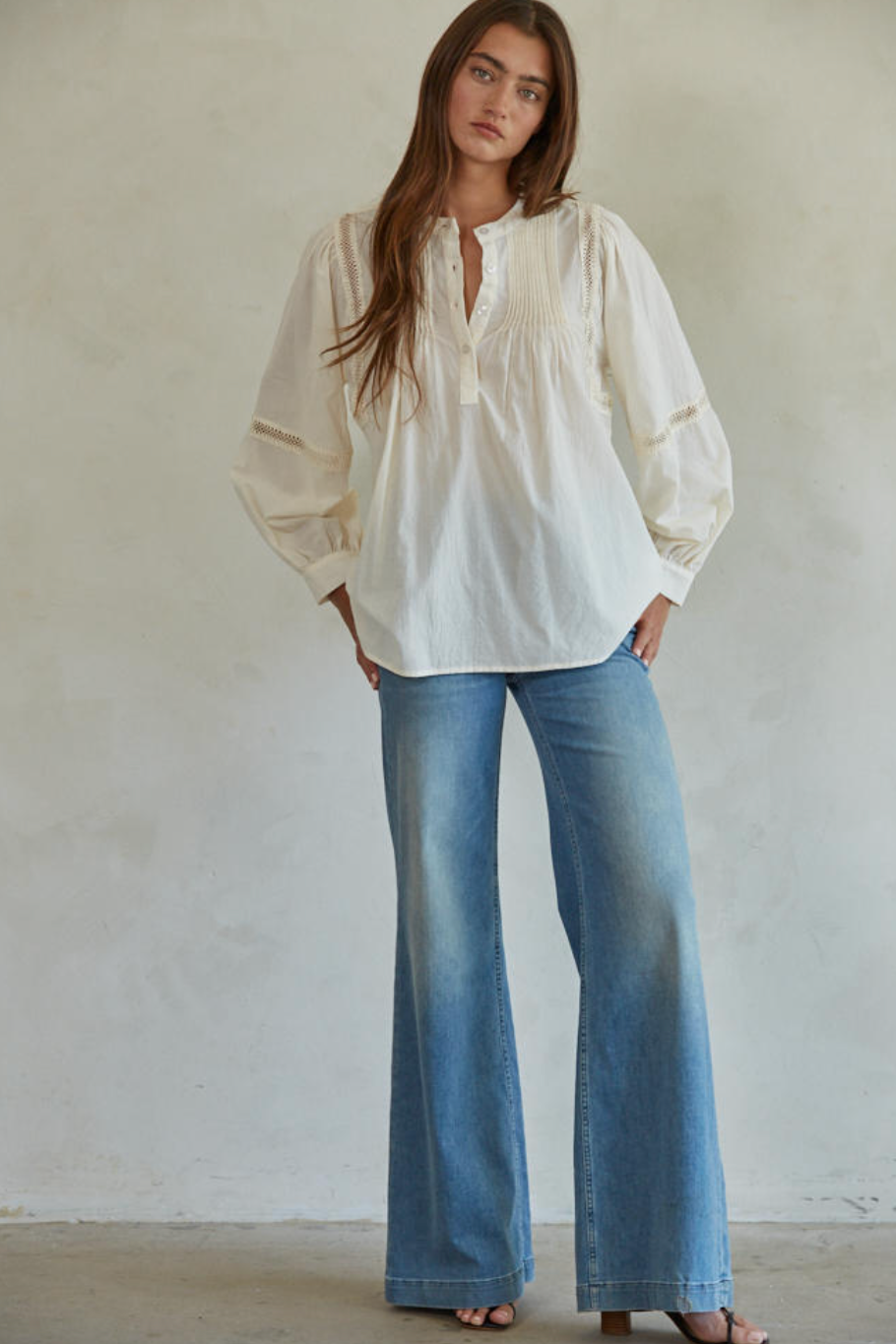 Woven Cotton Long Sleeve Button Up Round Neck Top w/ Lace and Pleats Detail