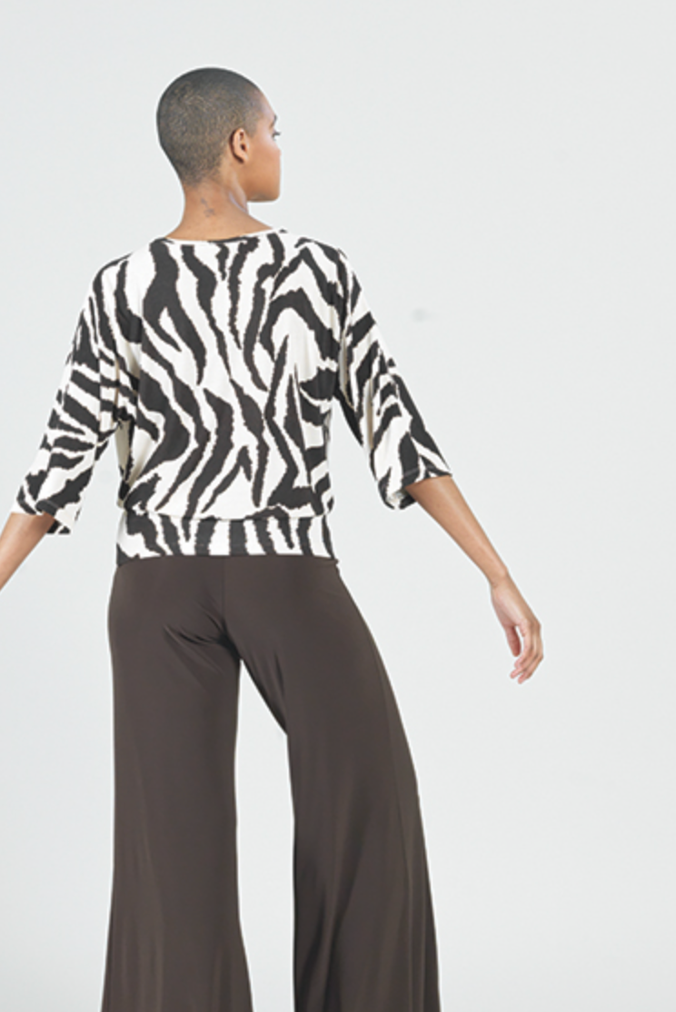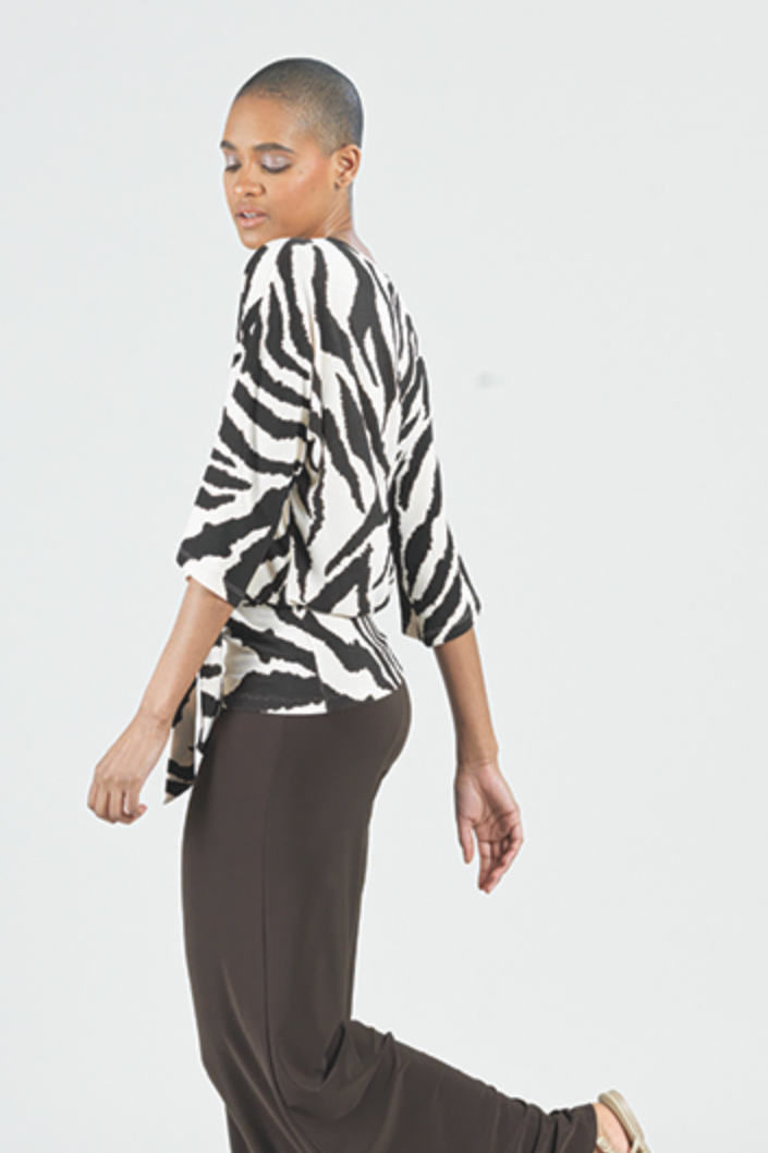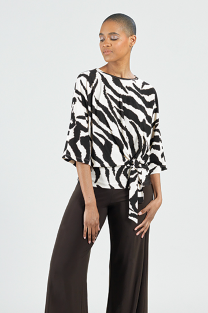 This zebra print top has a front tie detail that is flattering and can dress up. Looks great with blue or brown bottoms.